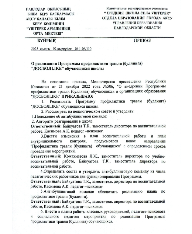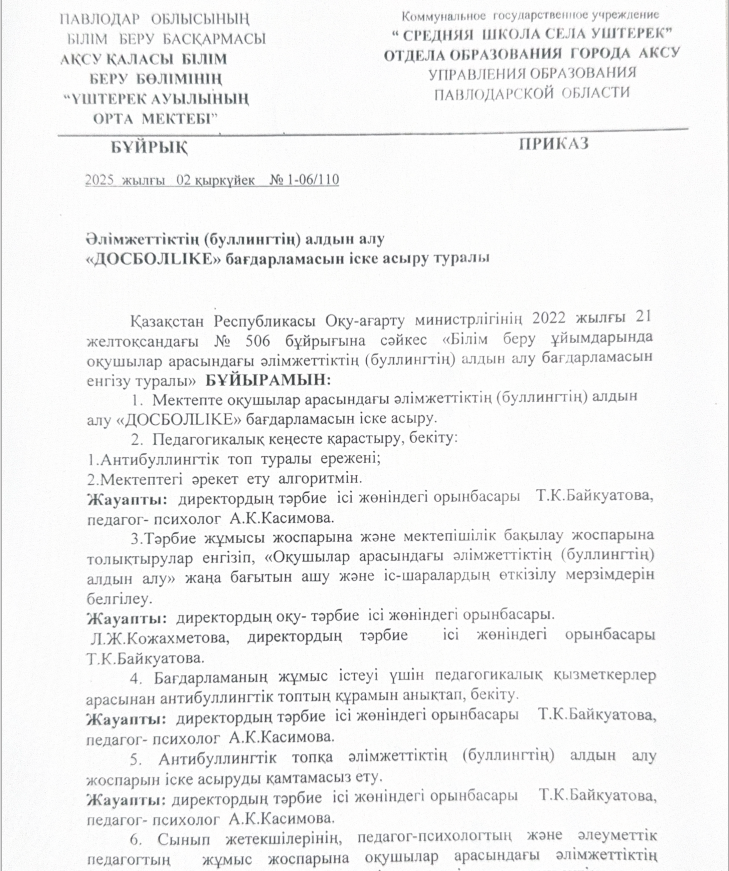 Әлімжеттіктің (буллингтің) алдын алу «ДОСБОЛLIKE» бағдарламасын іске асыру туралы бұйрық Posted on 04.12.202504.12.2025 By admin Мектеп психологы
