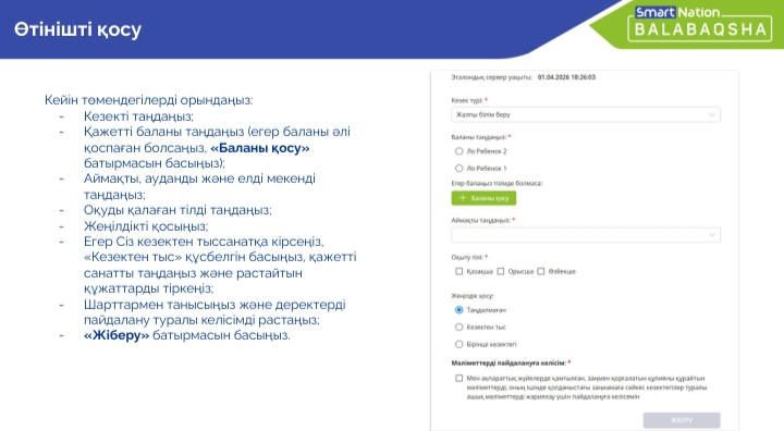 Ата-аналар назарына!Баланы кезекке қоюға жаңа сайтSmart Nation BALABAQSHA ақпараттық жүйе енгізілді. Posted on 07.04.202607.04.2026 By admin Мектепке дейінгі тәрбие мен оқыту